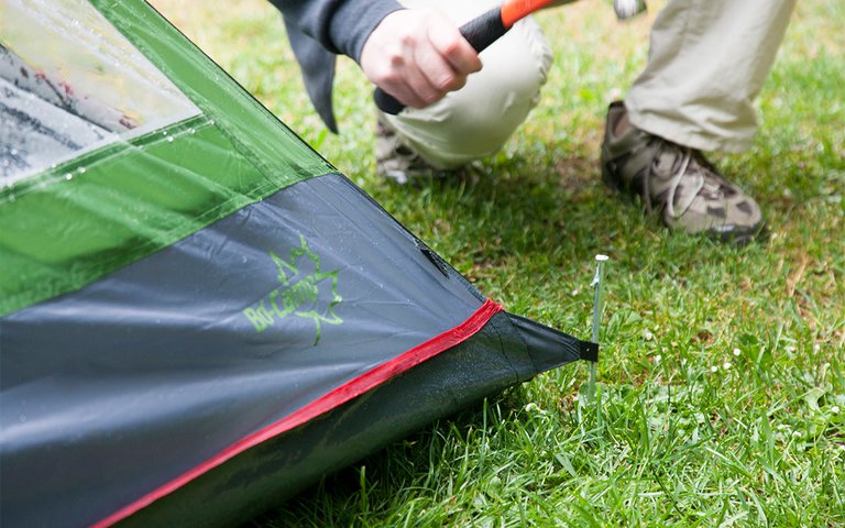 - Fixez la toile de tente au moyen des piquets sans trop la tendre.Enfoncez les piquets verticalement dans le sol (utilisez une grosse pierre comme maillet si le sol est trop dur) et le plus profondément possible. Laissez uniquement l’espace nécessaire pour faire passer l’anneau de la toile de tente. Emportez toujours des piquets de réserve avec vous, bien utiles si vous en perdez ou en endommagez un.
