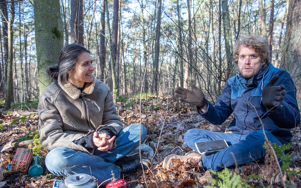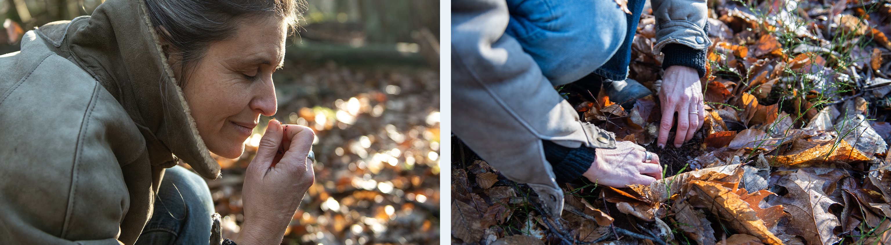 Ilse mélange les exercices classiques de l'école japonaise du bain de forêt avec sa propre interprétation. En y ajoutant par-ci par-là une influence du yoga, une autre de ses passions. Elle nous demande de creuser lentement un trou pour établir un contact conscient avec la terre. Nous retirons les feuilles, couche après couche. Nous frottons l'humus entre nos doigts et le respirons. Ensuite, nous goûtons un peu de terre. Ce n'est certainement pas de la haute cuisine, mais une sacrée expérience en tout cas.