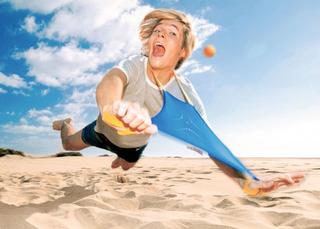 Le flingo est tout simplement la forme la plus complexe de beach-volley. Complexe, c'est le mot. Avec une balle de la taille d'une balle de ping-pong et une sorte de tablier pour remplacer vos mains, c'est un véritable sport d'adresse. Ce tablier est fait d'une matière élastique qui, lorsqu'elle est tendue, fait rebondir la balle au-dessus du filet à la manière d'un trampoline. Cela paraît un peu dingue, mais c'est la meilleure manière de s'amuser à la plage. Il est par contre nettement moins facile de faire un smash.